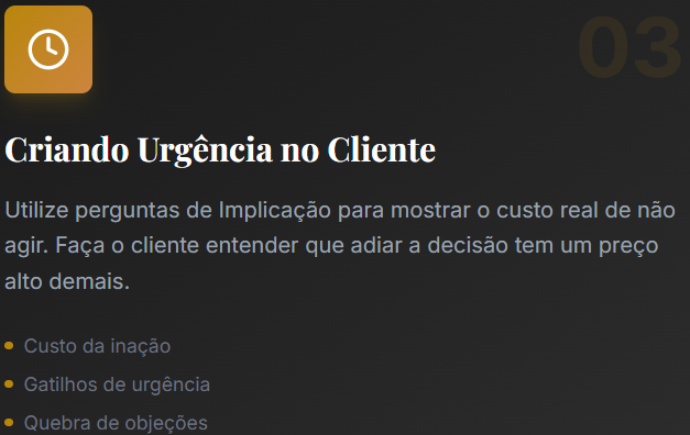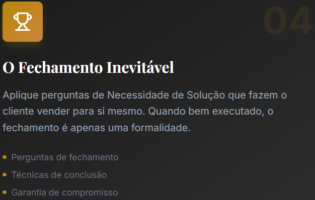 O SPIN Selling foi desenvolvido especificamente para vendas complexas e de alto valor, onde o ciclo de venda é mais longo e envolve múltiplas interações. Funciona excepcionalmente bem em vendas B2B, serviços profissionais, consultorias, clínicas, e qualquer situação onde você precisa construir valor antes de fechar. Para vendas transacionais simples, pode ser um exagero, mas para contratos de médio e alto valor, é a metodologia mais eficaz do mercado.